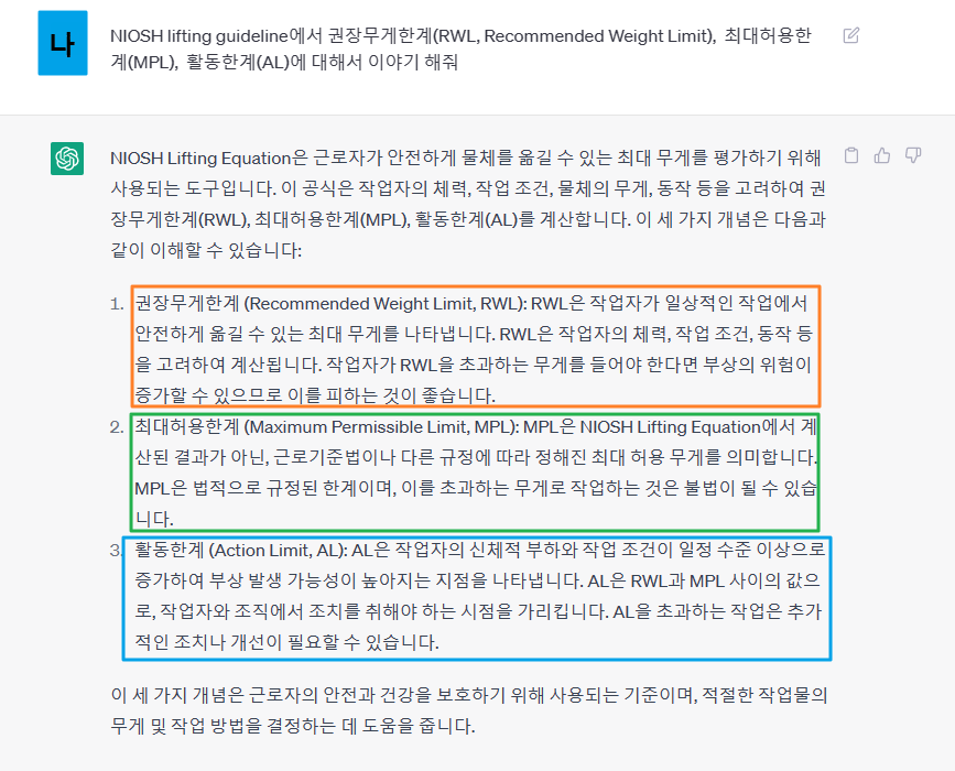 NIOSH에서 나온 작업자가 짐을 옮길 때의 무게에 대한 새로운 용어 권장무게한계를 앞전에서 보았던 최대허용한계와 활동한계를 비교해 보았다.