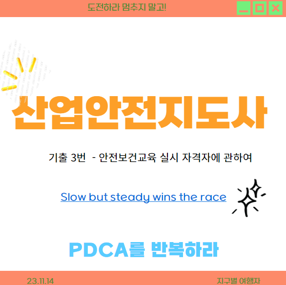 | 산업안전지도사 건설안전기사 공부 기출문제 2번, 9월 28일부터 교육이 일부 변경 시행됨 (0) | 2023.11.14 |