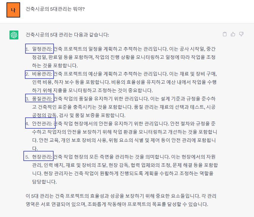 챗 gpt에게 5대 관리가 무엇인지 물어봄