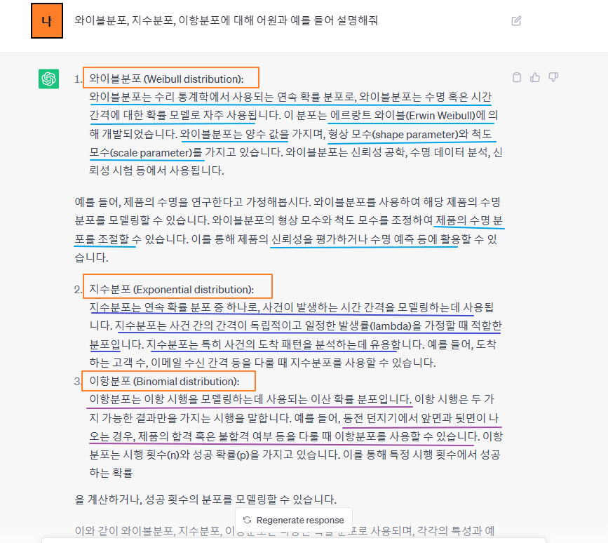 아래에 와이블분포와 지수분포, 이항분포에 대한 설명은 참고조로 당연히 물어봐야 한다.