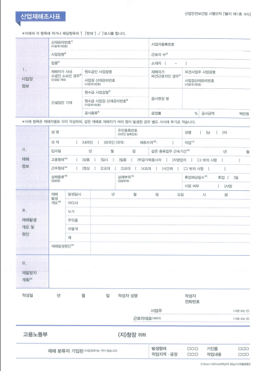 그럼 산업재해 보고서에 작성해서 기록보존해야 할 항목은 몇가지 인가? 모두 4가지이다.