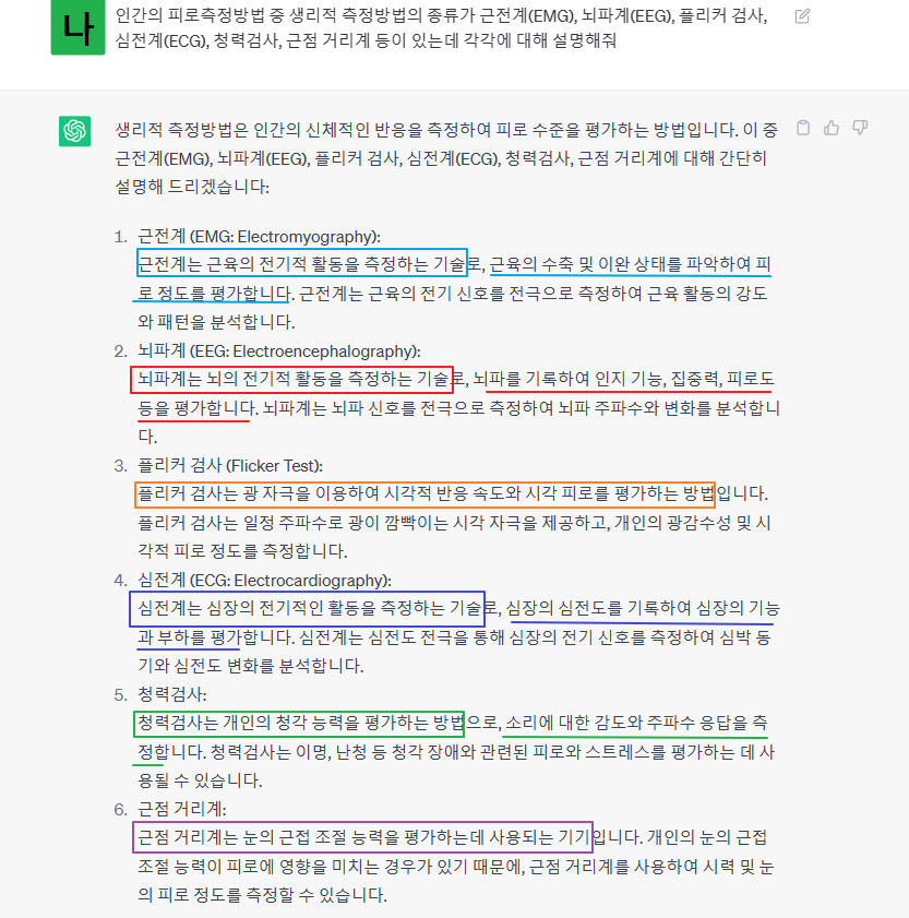2. 측정방법 : 근전계(EMG), 뇌파계(EEG), 플리커 검사, 심전계(ECG), 청력검사, 근점 거리계
